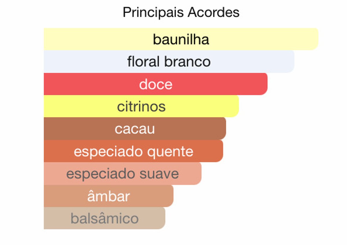 Os principais acordes são floral branco, baunilha, doce, especiarias quentes e suaves, com toques de cítrico e balsâmico. É um perfume feminino com uma projeção e fixação consideradas boas, ideal para uso em dias frescos e eventos noturnos