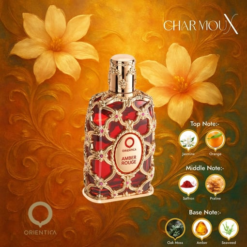 Amber Rouge abre com a luminosidade intensa de jasmim e laranja, numa combinação vibrante e cativante. No coração, o açafrão e o praliné conferem calor e exotismo refinado. A base desenvolve-se com musgo de carvalho, âmbar e algas-marinhas, entregando uma secagem elegante, resinoso-marinha, que permanece na pele muito para lá do instante da aplicação.