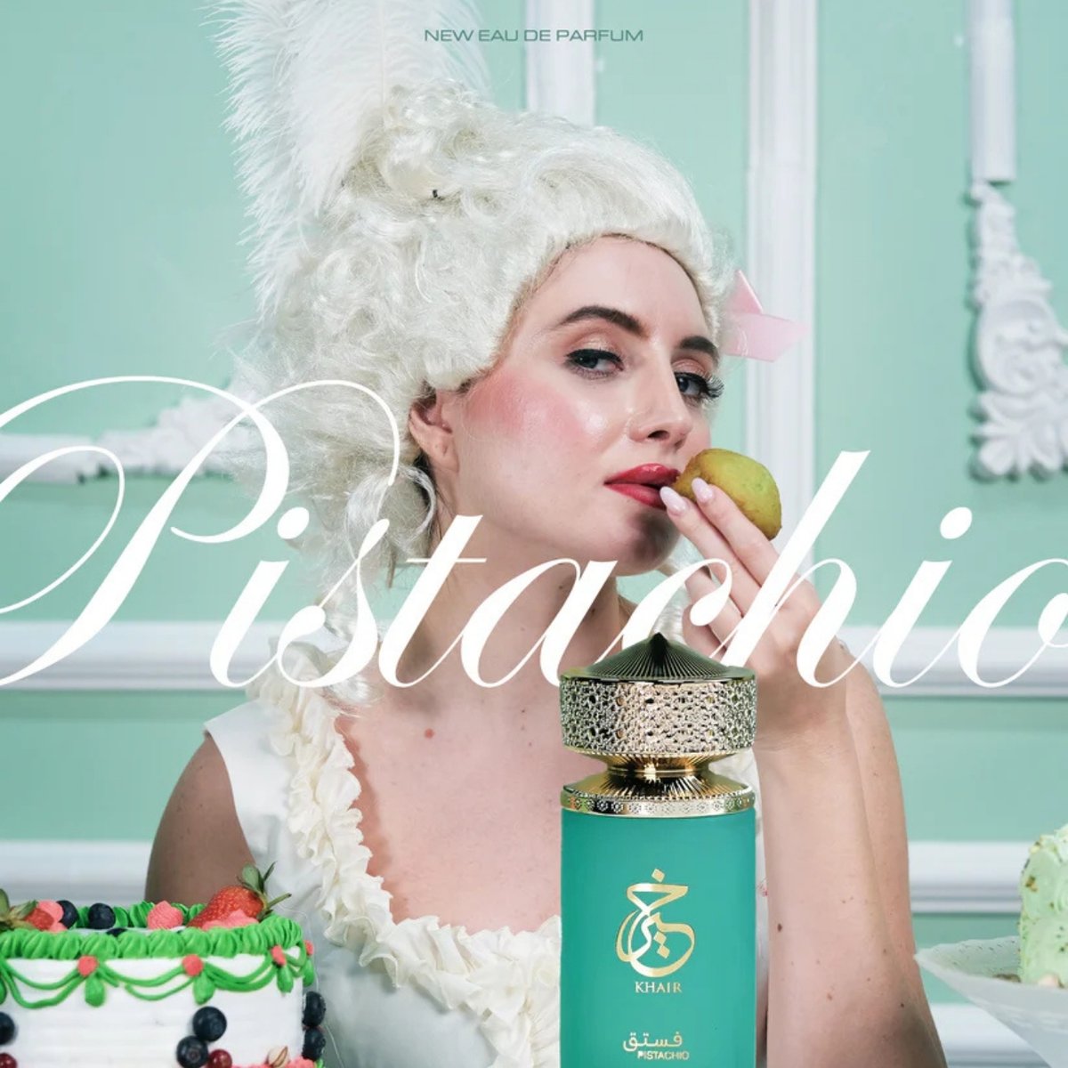 Desperte os sentidos com Khair Pistachio – a fusão perfeita entre pistache gelato cremoso e madeiras quentes para uma experiência olfativa inesquecível.