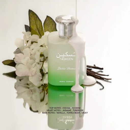 Taskeen Lactéa Divina é uma criação unissexo da coleção gourmand-floral de Paris Corner. Uma fragrância que combina a suavidade do leite, a doçura do chocolate e a elegância das flores brancas perfeita para momentos especiais.