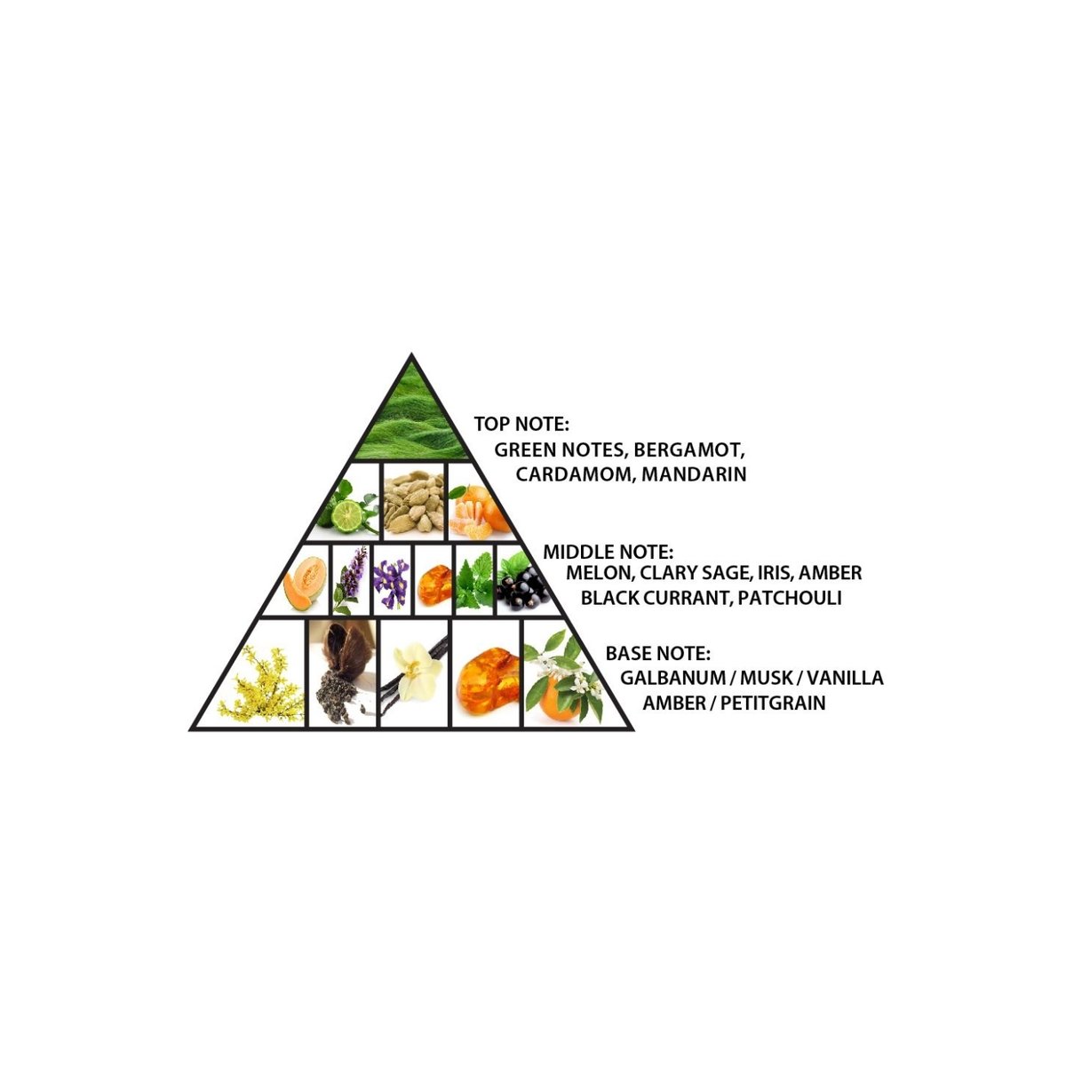 Notas de Coração: 🍈 Melão, 🌿 Sálvia esclareia, 💐 Íris, 🧡 Âmbar, 🍇 Groselha preta, 🌱 Patchouli