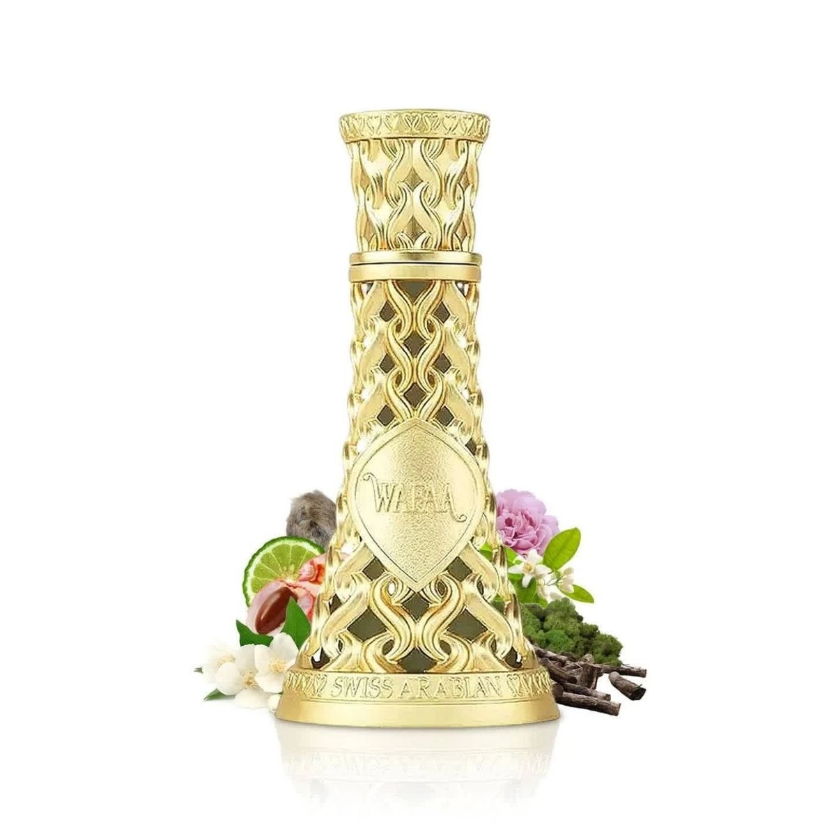 Wafaa da Swiss Arabian é uma celebração do luxo oriental. A fragrância abre com uma combinação intensa e especiada de noz-moscada e açafrão, que introduz uma aura misteriosa e sofisticada. O coração revela jasmim e rosa envoltos em calor, enquanto a base traz a riqueza do oud, sândalo, âmbar e couro, criando uma assinatura olfativa rica, intensa e envolvente. É o perfume ideal para quem aprecia tradição, profundidade e elegância em todos os detalhes.